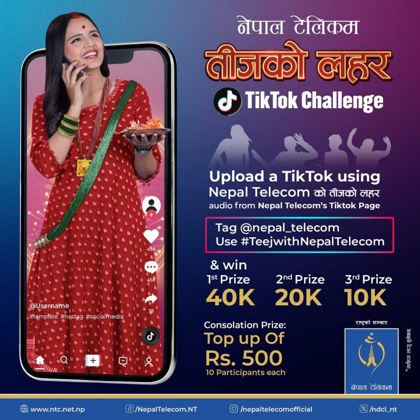 नेपाल टेलिकमको तीजको लहर गीतमा टिकटक बनाई यसमा सहभागी हुन सकिने छ। सो च्यालेन्ज हिजो भदौ २४ गतेदेखि प्रारम्भ भएको छ र आगामी असोज ७ गतेसम्म सहभागी हुन सकिनेछ।
