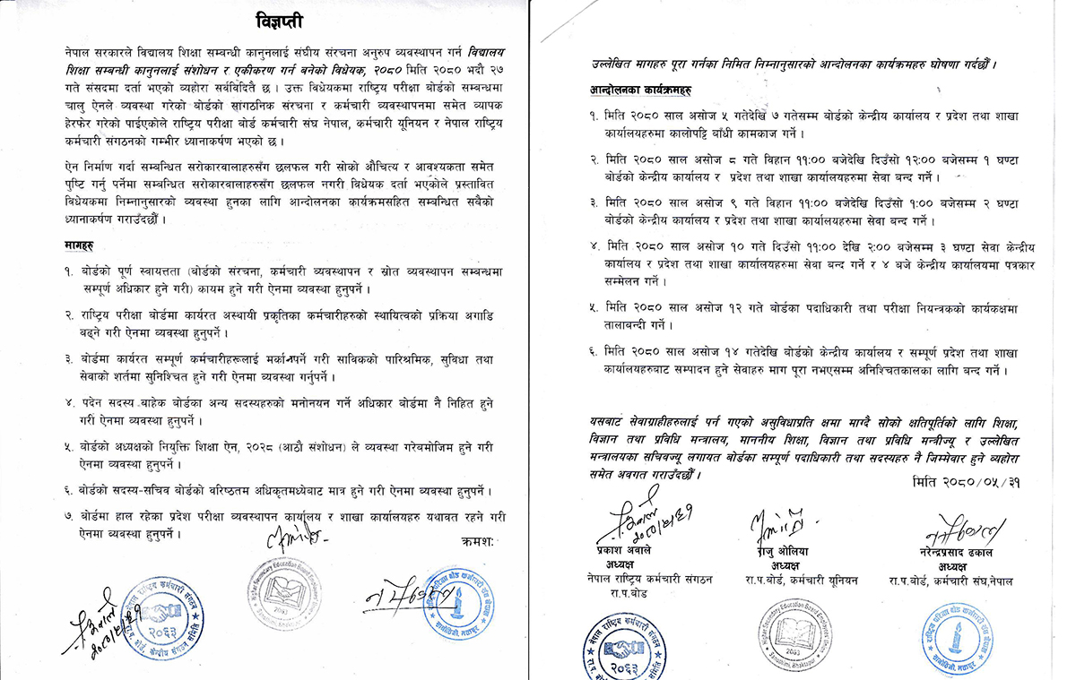 शिक्षा विधेयक परिमार्जन नभए राष्ट्रिय परीक्षा बोर्डको सेवा ठप्प पार्ने कर्मचारीको चेतावनी