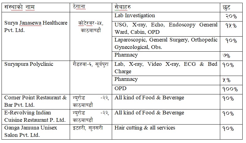 संस्थाहरु र प्राप्त गर्न सकिने छुट निम्न छन्ः