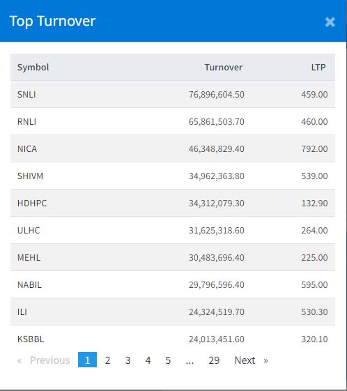 आज सेयर बजार घट्दा पनि सन नेपाल लाइफ इन्स्योरेन्सको सर्वाधिक कारोबार भएको छ ।कम्पनीको यस दिन ७ करोड ६८ लाख ९६ हजार रुपैँया बराबरको कारोबार भएको छ । त्यस्तै, रिलायबल लाइफ इन्स्योरेन्सको ६ करोड ५८ लाख ६१ हजार रुपैयाँ, एनआइसी एशिया बैंकको ४ करोड ४३ लाख ४८ हजार रुपैयाँ, शिवम् सिमेन्टको ३ करोड ४९ लाख ६२ हजार रुपैयाँ र हिमाल दोलखा हाइड्रोपावरको ३ करोड ४३ लाख १२ हजार रुपैयाँको कारोबार भएको हो ।