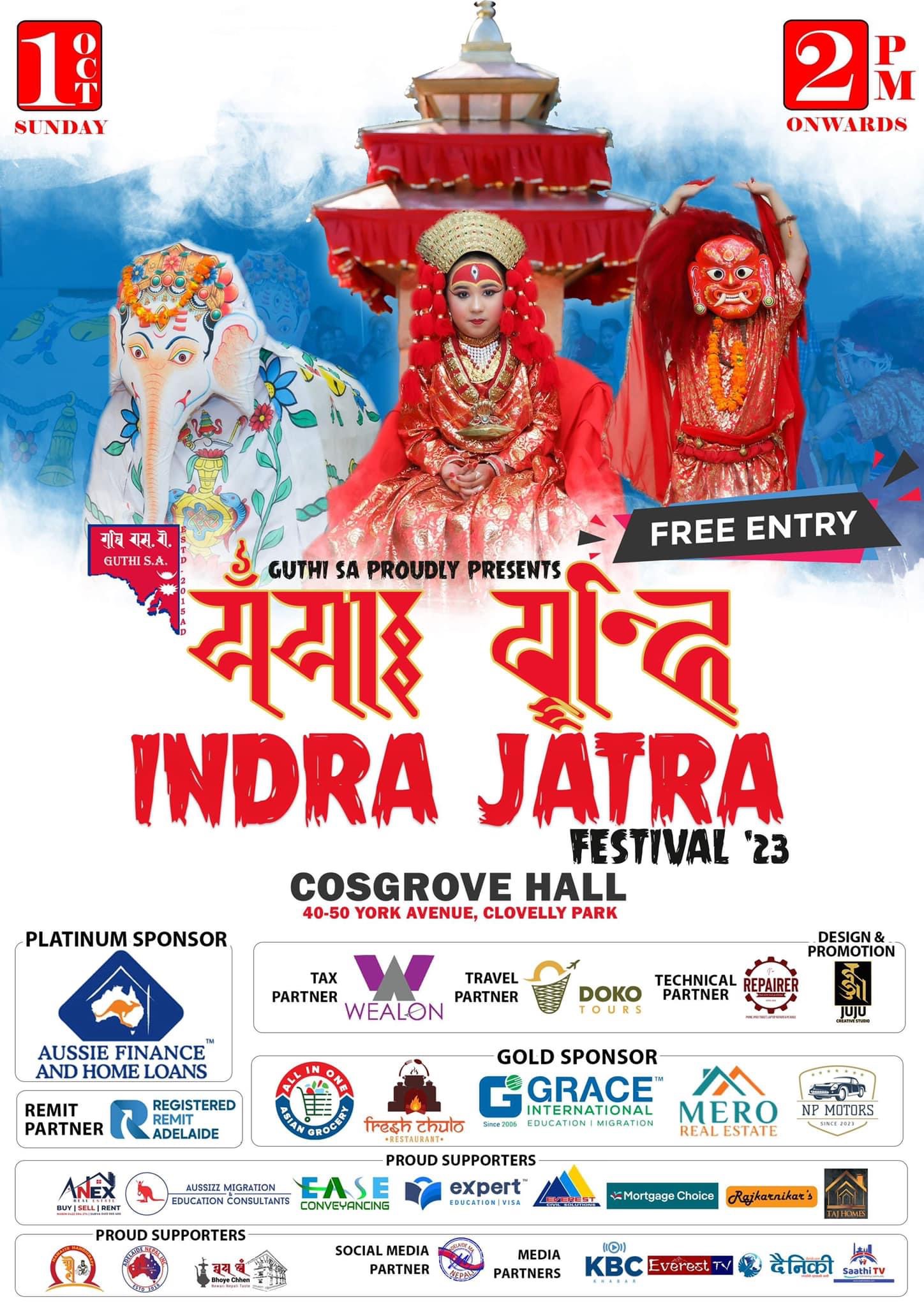 यसै क्रममा नेपालको महत्वपुर्ण जात्रा `ईन्द्र जात्रा´ एडिलेडमा छैठौ पटक हुने भएको । गुठी साउथ अष्ट्रेलियाले अक्टोवर १ आइतवार इन्द्र जात्रा मनाउने भएको हो ।