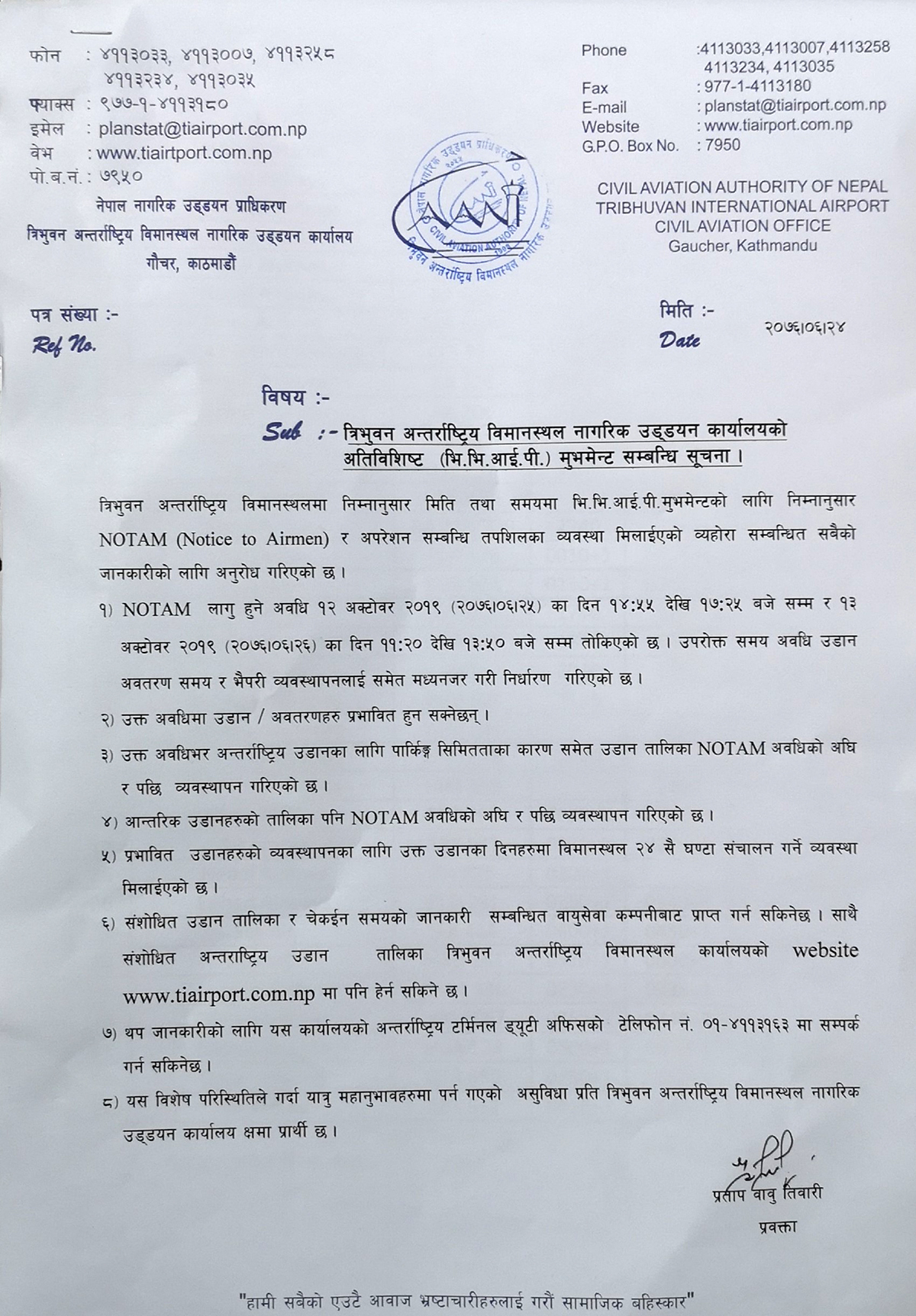 प्राधिकरणका अनुसार शनिबार दिउँसो २ बजेर ५५ मिनेटदेखि ५ बजेर २५ मिनेटसम्म तथा आइतबार बिहान ११ बजेर २० मिनेटदेखि दिउँसो १ बजेर ५० मिनेटसम्म आन्तरिक र बाह्यतर्फका सबै उडान प्रभावित हुने जनाएको छ । प्रभावित उडानहरूको व्यवस्थापनका लागि विमानस्थल भने २४ सै घण्टा सञ्चालन गरिने जनाइएको छ ।