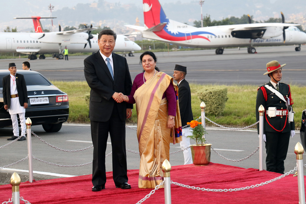 २५ असोज, काठमाडौँ । चिनियाँ राष्ट्रपति सी जिनपिङ नेपाल आइपुगेका छन् । राष्ट्रपति सी ४ बजेर ५५ मिनेटमा काठमाडाैँस्थित त्रिभुवन विमानस्थलमा अवतरण गरेका हुन । त्रिभुवन अन्तर्राष्ट्रिय विमानस्थलमा सीलाई समकक्षी विद्यादेवी भण्डारीले स्वागत गरेकी छिन । यस्तै सीलाई स्वागत गर्न उपराष्ट्रपति नन्दबहादुर पुन, प्रधानमन्त्री केपी शर्मा ओली, उपप्रधानमन्त्री इश्वर पोखरेल लगाएत मन्त्रीहरु विमानस्थल पुगेका थिए ।