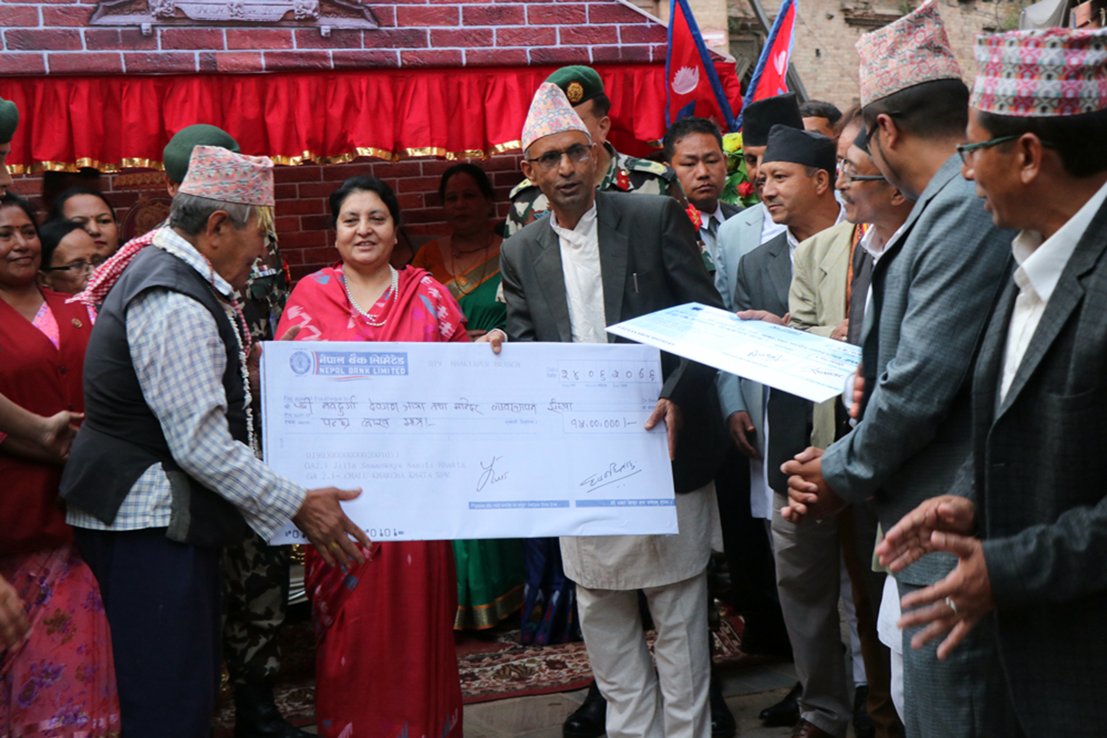 कार्यक्रममा श्री देवगण तथा मन्दिर व्यवस्थापन संस्थालाई जात्रा सञ्चालनार्थ अक्षयकोष स्थापनाका लागि जिल्ला समन्वय समिति भक्तपुरका प्रमुख नवराज गेलालले रु १५ लाख तथा उद्योग वाणिज्य सङ्घका अध्यक्ष रामप्रसाद प्रजापतिले रु पाँच लाखको चेक हस्तान्तरण गर्नुभएको थियो । त्यसअवसरमा तलेजुका मूल नाइके नरेन्द्रप्रसाद जोशीले राष्ट्रपति भण्डारीलाई तलेजुको प्रसाद प्रदान गर्दै आर्थिक अभाव र पारिश्रमिक नहुँदा तलेजुको परम्परागत पर्वहरु बन्द गर्नुपर्ने अवस्थामा पुगेकाले सरकारमार्फत सहयोग गरिदिन आग्रह गर्नुभयो ।