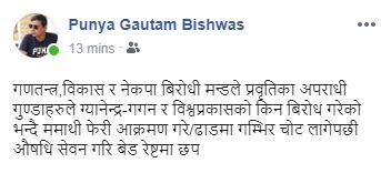 गगन थापा र ज्ञानेन्द्र शाहीको आलोचना गरेको भन्दै पुण्य गौतममाथि आक्रमण, ढाडमा गम्भीर चोट