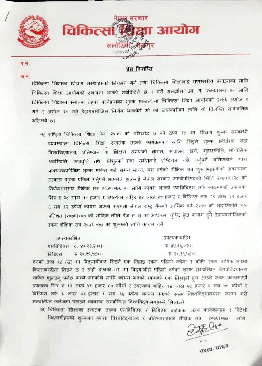 मेडिकल शिक्षाको शुल्क तोकियो, एमबीबीएस पढ्न काठमाडाैँभित्र ४० लाख र बाहिर ४४ लाख