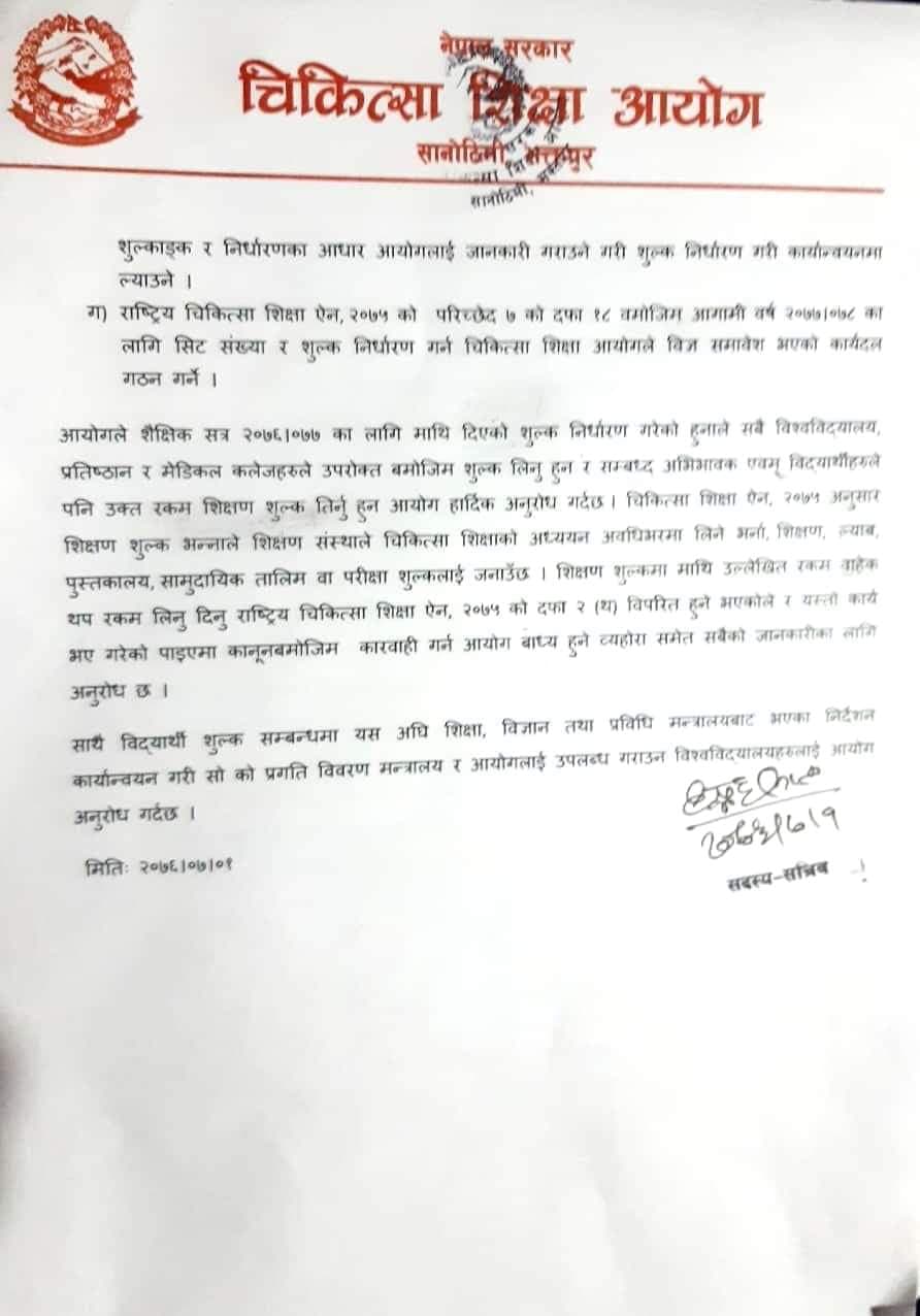 आयोगले काठमाडौँ उपत्यकाभित्र एक तिहाइ बराबर पहिलो वर्ष रु १३ लाख ४१ हजार ८५, उपत्यका बाहिर रु १४ लाख ७८ हजार ६७५ एमबीबीएसतर्फ र रु ६ लाख ७३ हजार १९४ शुल्क बीडीएसका लागि कायम भएको रकम विश्वविद्यालयमा जम्मा गरी सम्बन्धित कलेजमा पठाउने व्यवस्था सम्बन्धित विश्वविद्यालयले मिलाउनुपर्ने जनाएको छ । चिकित्सा शिक्षा ऐनअनुसार शिक्षण शुल्कमा भर्ना शुल्क, शिक्षण, प्रयोगशाला, पुस्तकालय, सामुदायिक तालीम वा परीक्षा शुल्कलाई जनाउने भन्ने विषयलाई समेत पुनः स्मरण गराएको छ ।